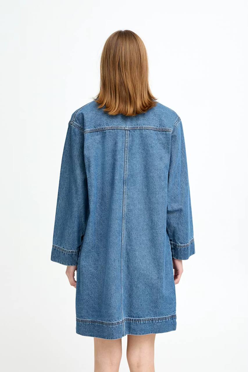 Abito corto in denim dal design casual e contemporaneo, caratterizzato da linea dritta e vestibilità morbida che assicura comfort durante tutta la giornata. Presenta colletto classico, chiusura frontale con bottoni a vista e ampie tasche applicate sul petto che aggiungono un tocco pratico e moderno. Le maniche lunghe e il lavaggio medio donano un aspetto autentico e versatile, perfetto da indossare sia con sneakers per il tempo libero sia con stivaletti per un look più ricercato.