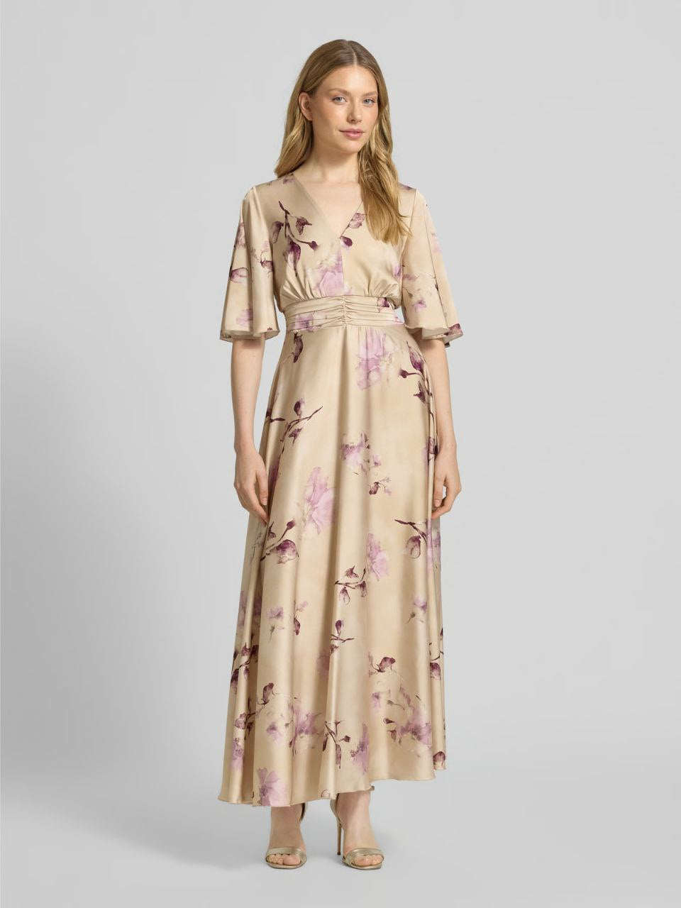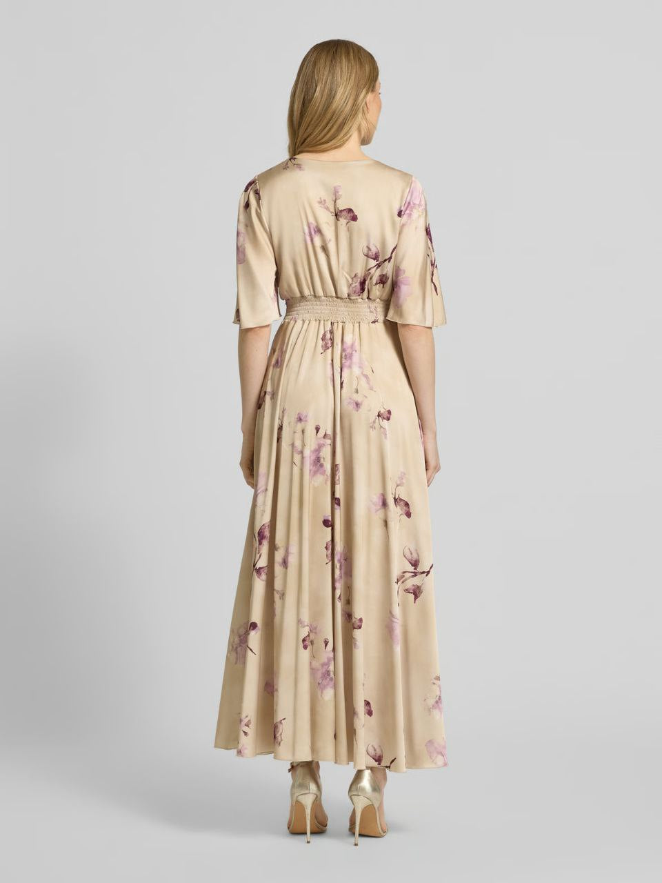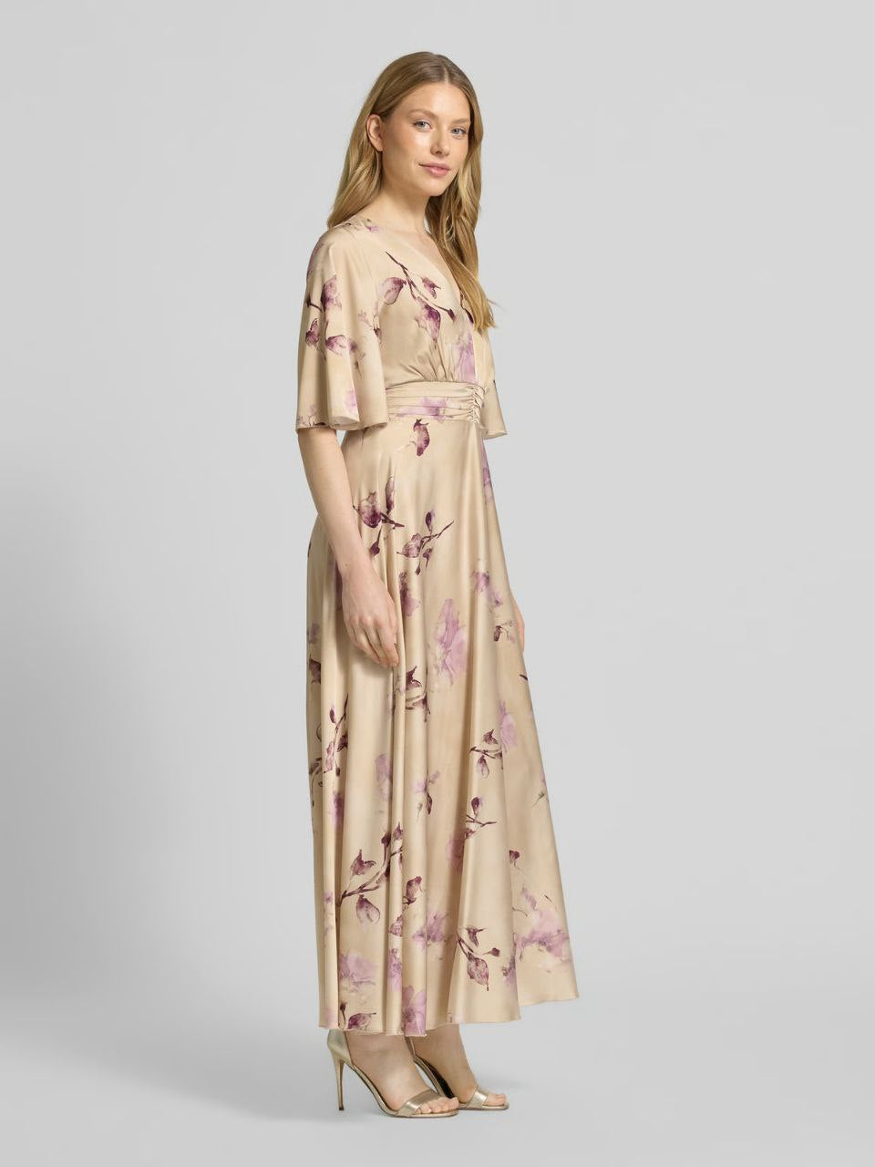 Abito lungo in satin color champagne con stampa floreale rosa e lilla. Scollo a V, maniche ampie a kimono e cintura sotto il seno che valorizza la figura. Elegante e femminile, ideale per cerimonie e occasioni speciali.