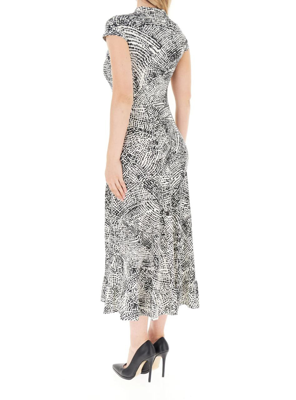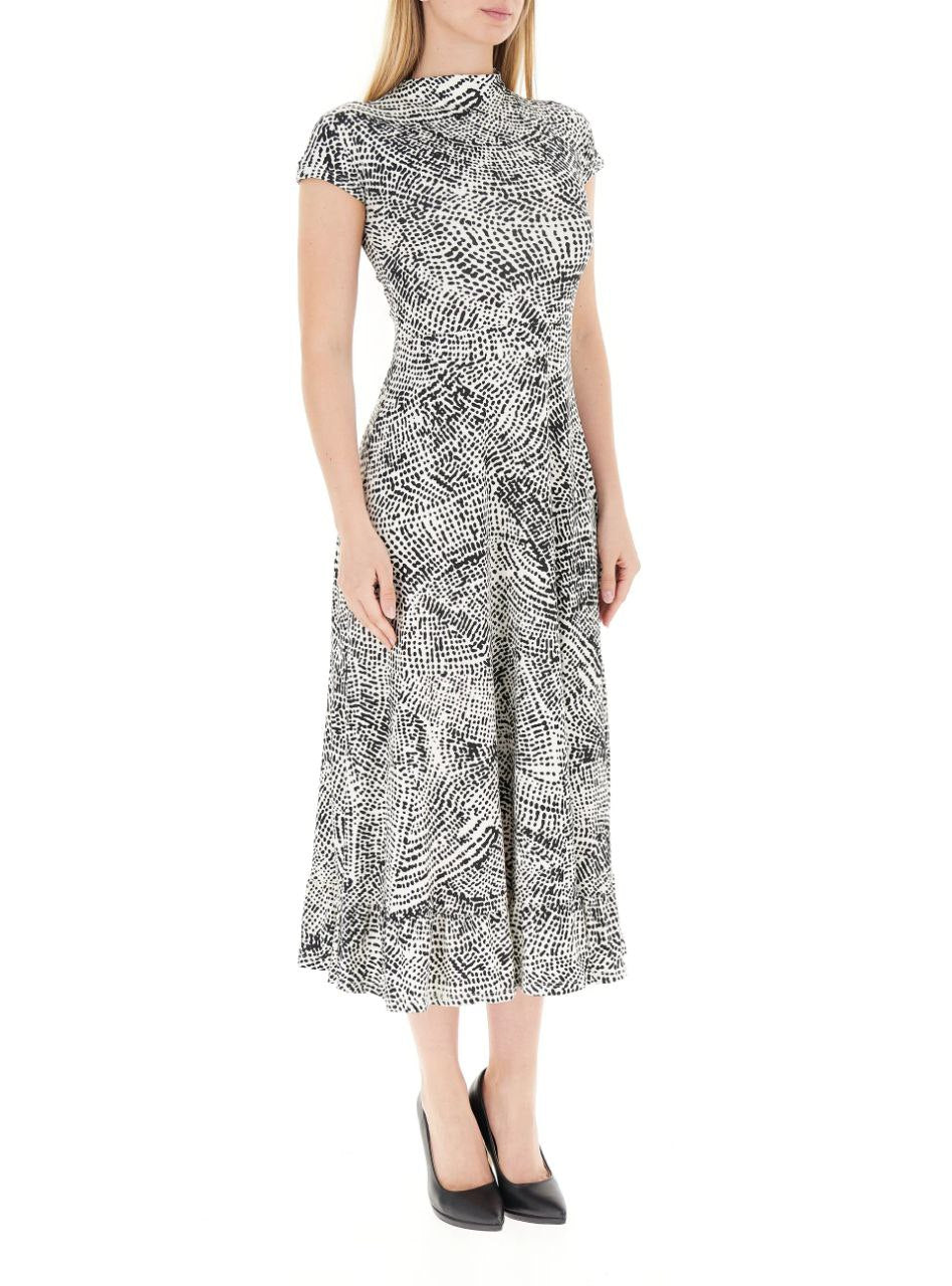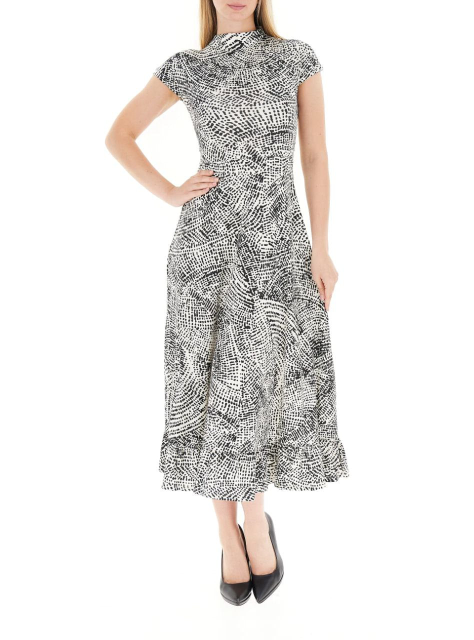 Abito midi a fantasia astratta in bianco e nero, con collo alto morbido e maniche corte. Linea svasata che valorizza la silhouette, perfetto per un look elegante e moderno.