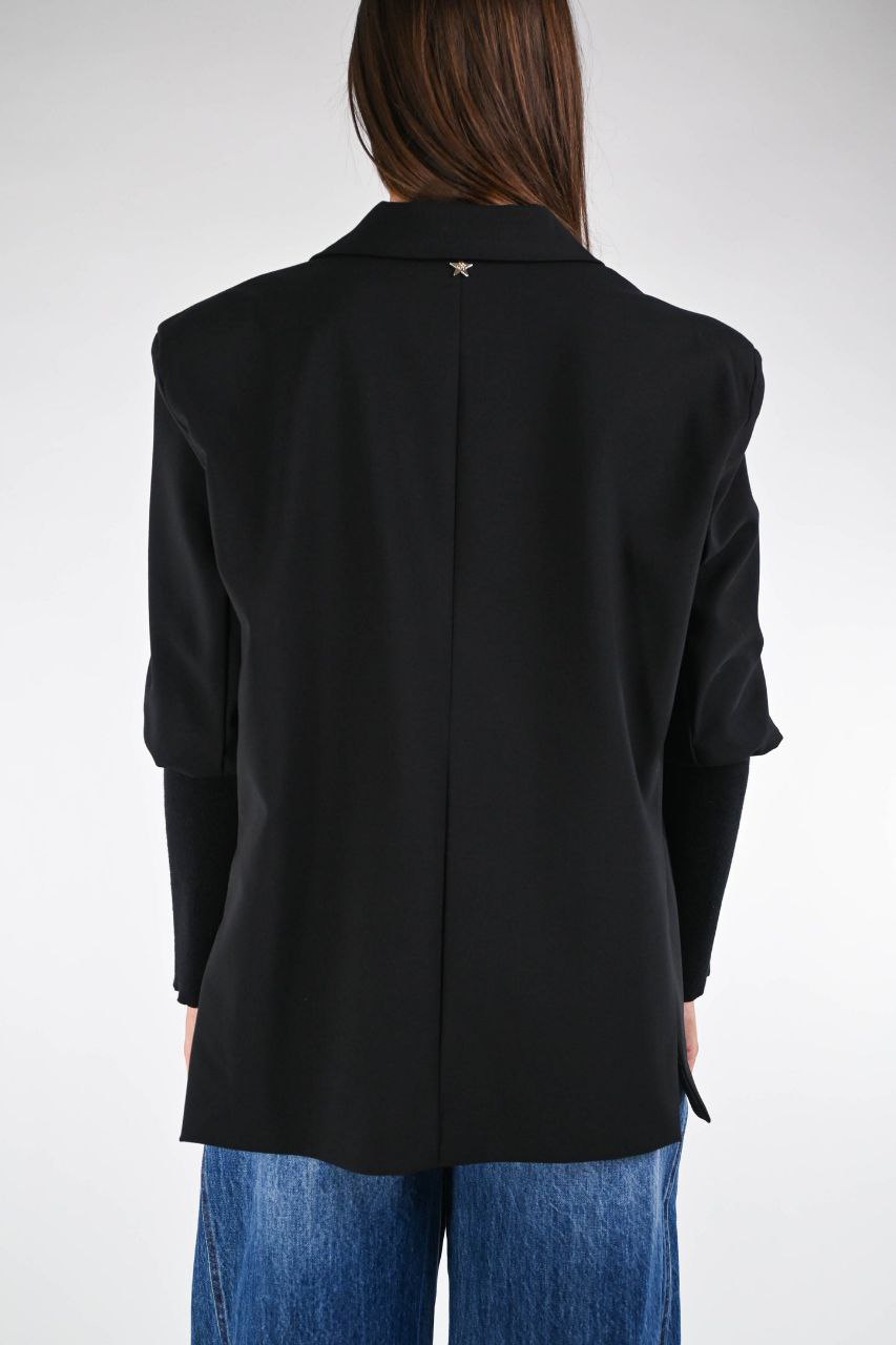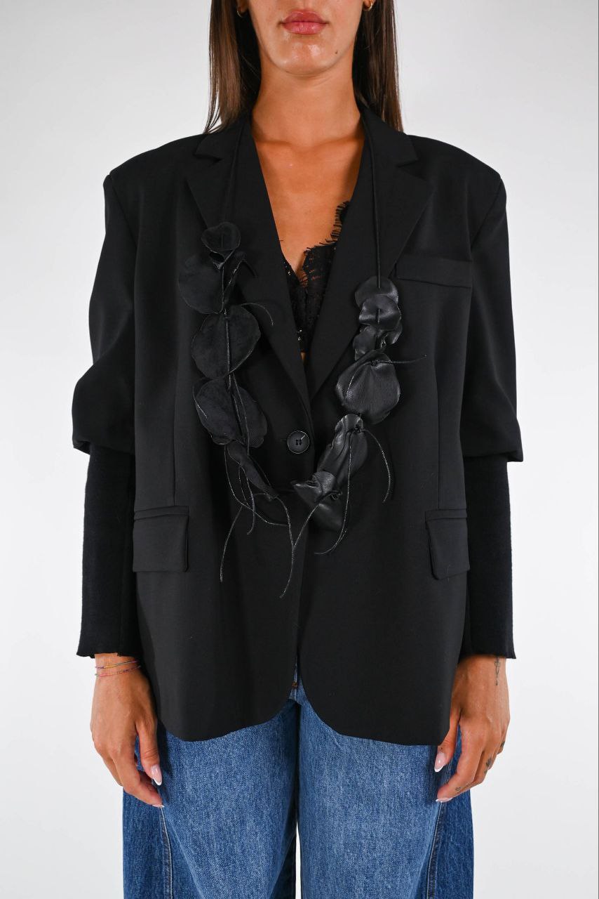 Blazer nero dal taglio morbido e contemporaneo, con rever classico, chiusura a un bottone e tasche con patta. Dettaglio decorativo sul davanti con applicazioni effetto petali che donano un tocco elegante e originale. Perfetto per look sofisticati e versatili.