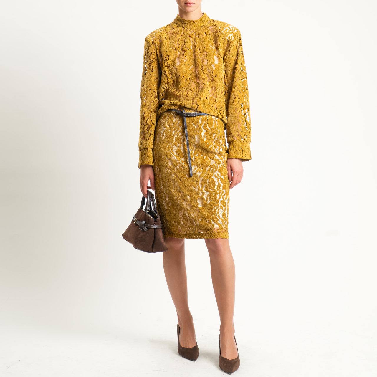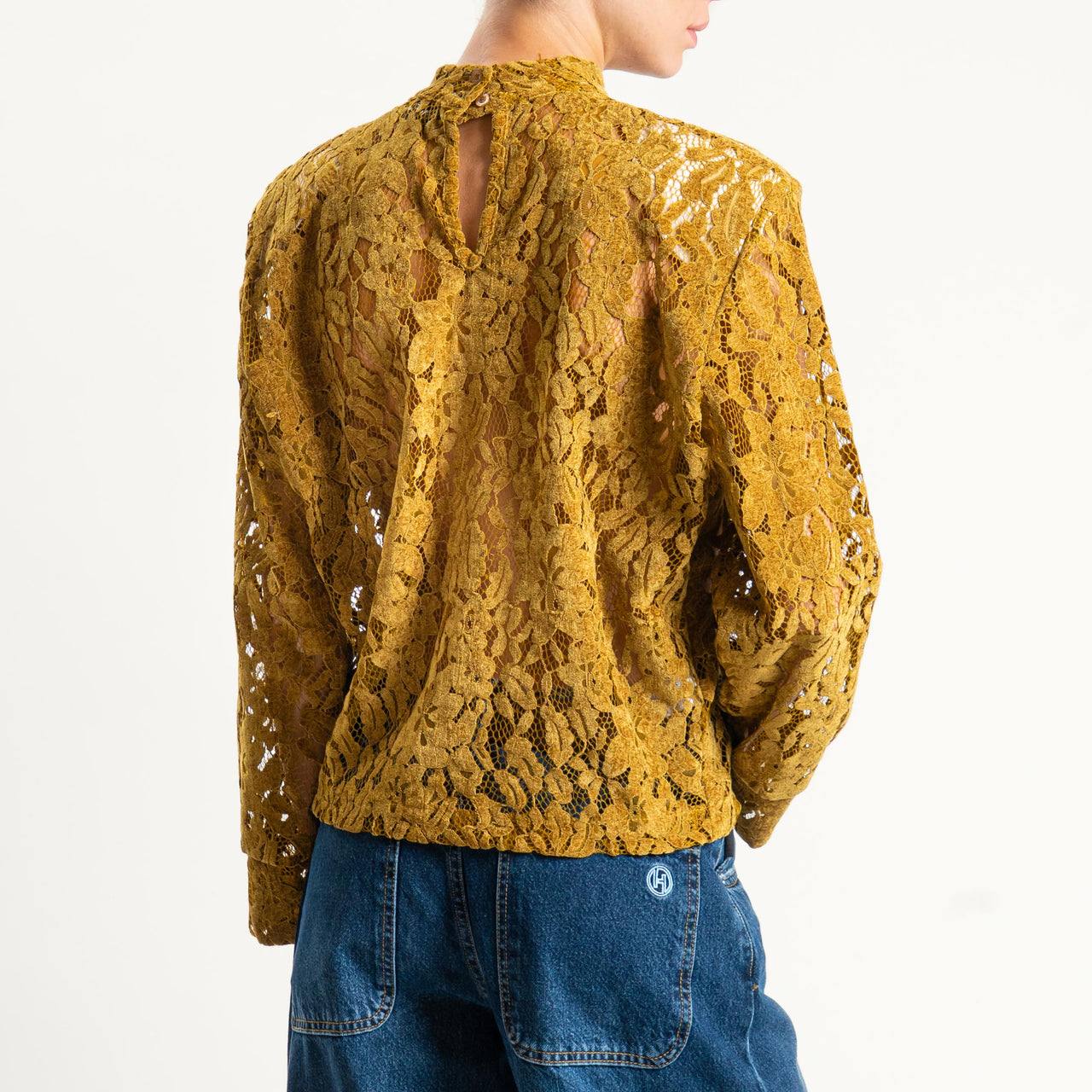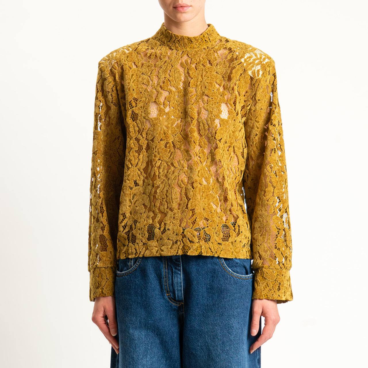 Camicia elegante e raffinata realizzata in pizzo floreale color senape, con trasparenze che donano un tocco sofisticato e femminile. Caratterizzata da maniche lunghe, collo leggermente alto vestibilità dritta, è un capo versatile perfetto da indossare sopra top a contrasto o bralette, ideale per look chic e contemporanei
