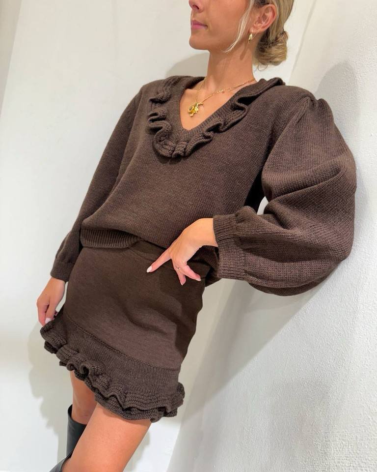 Questo coordinato elegante in tonalità marrone è perfetto per un look sofisticato e comodo. Composto da un pullover a maniche lunghe con un delicato motivo a volant sul colletto e una gonna corta coordinata, presenta dettagli ricercati che aggiungono un tocco femminile e raffinato. L'abbinamento di maglia e gonna con orlo a volant crea un equilibrio perfetto tra stile e comfort. Il tutto è completato da stivali alti, rendendolo ideale per le stagioni più fredde. Perfetto per una giornata casual o una serata special