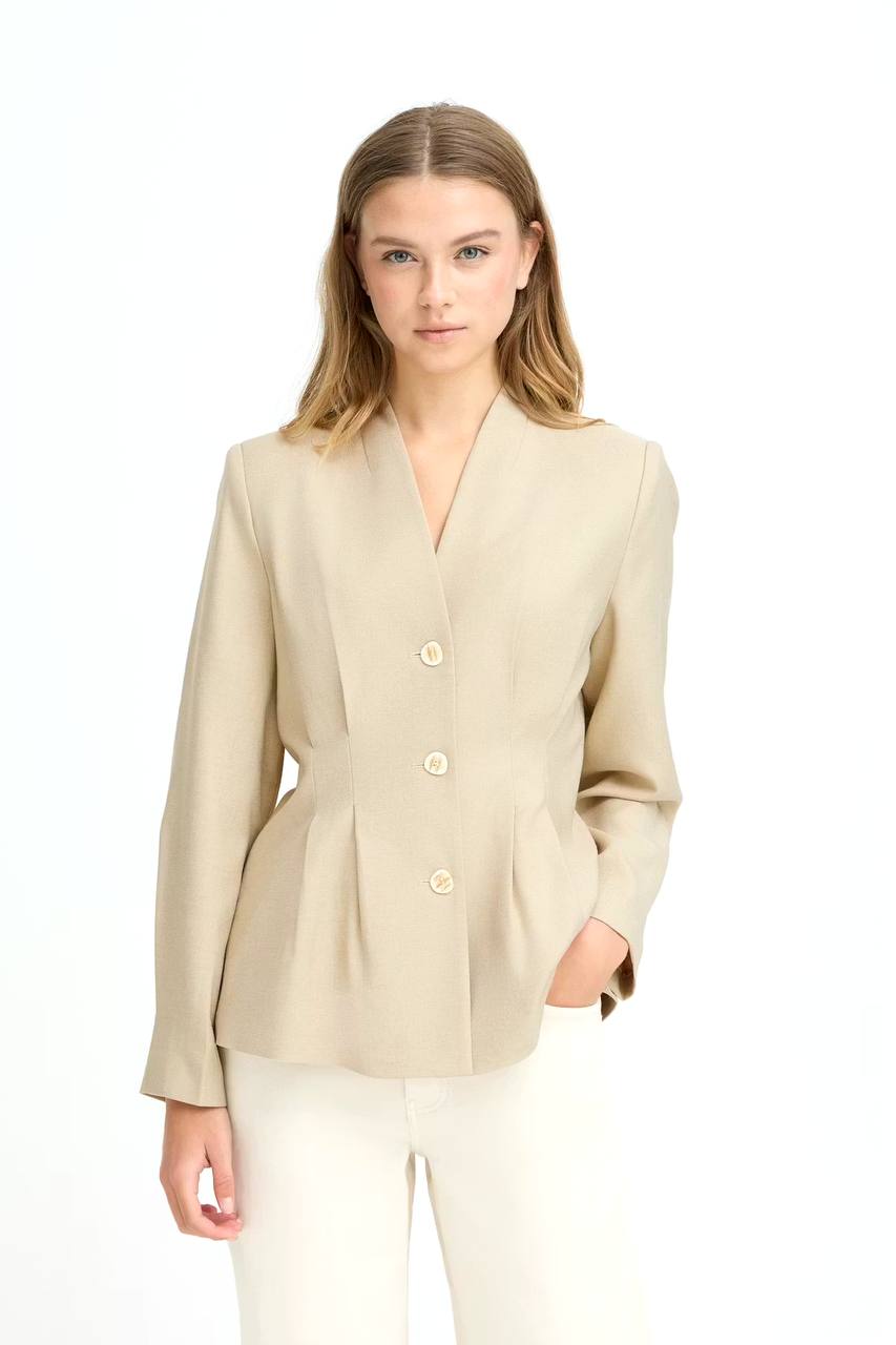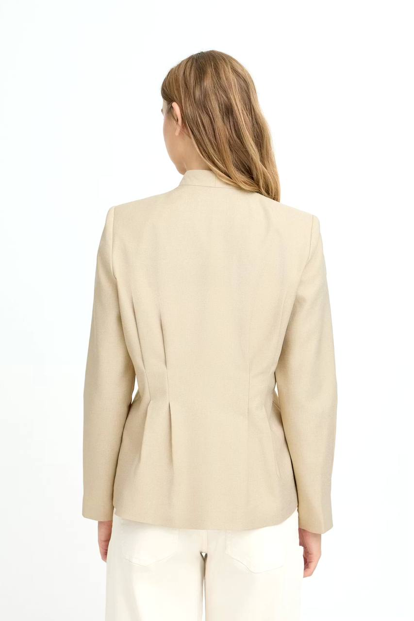 Giacca blazer dal taglio sartoriale in tonalità beige, caratterizzata da una silhouette femminile e strutturata. Presenta scollo a V senza rever, chiusura frontale con tre bottoni e linea leggermente svasata che valorizza il punto vita. Le spalle sono definite e le maniche lunghe completano il design essenziale ed elegante. Perfetta per look formali o per aggiungere un tocco raffinato agli outfit quotidiani.