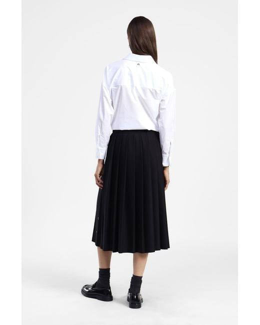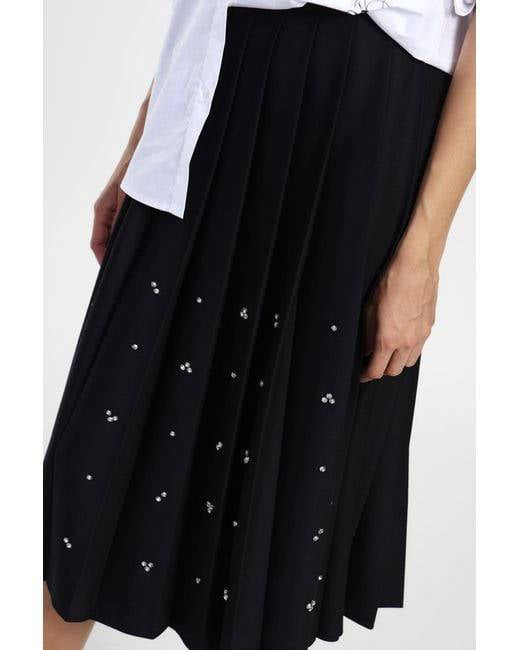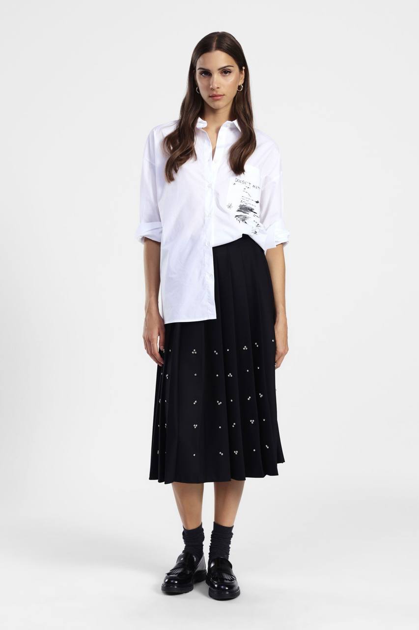 Gonna midi nera a vita alta con pieghe morbide e applicazioni di micro perline che aggiungono un tocco elegante e luminoso. Perfetta per look da giorno o da sera.