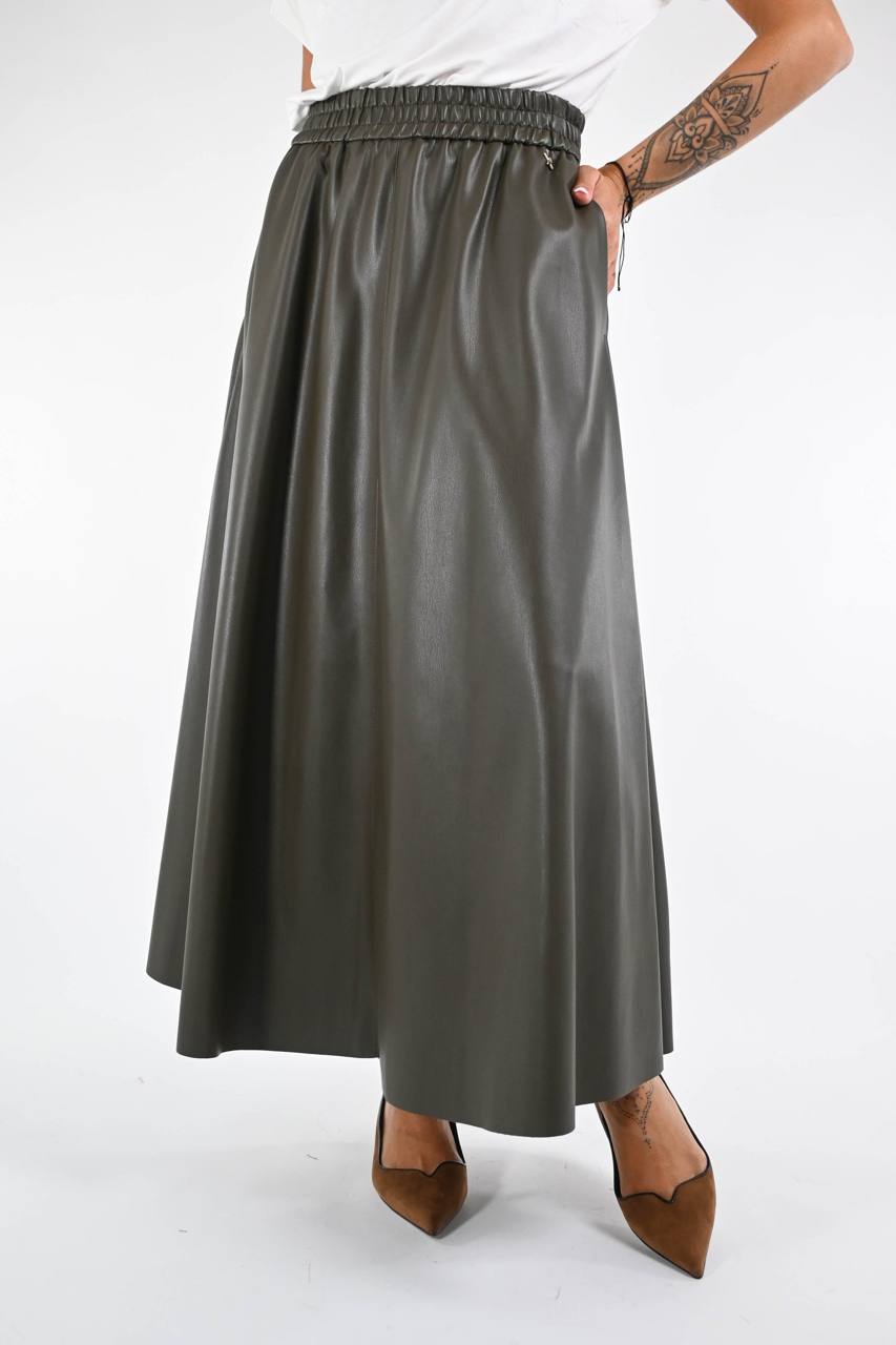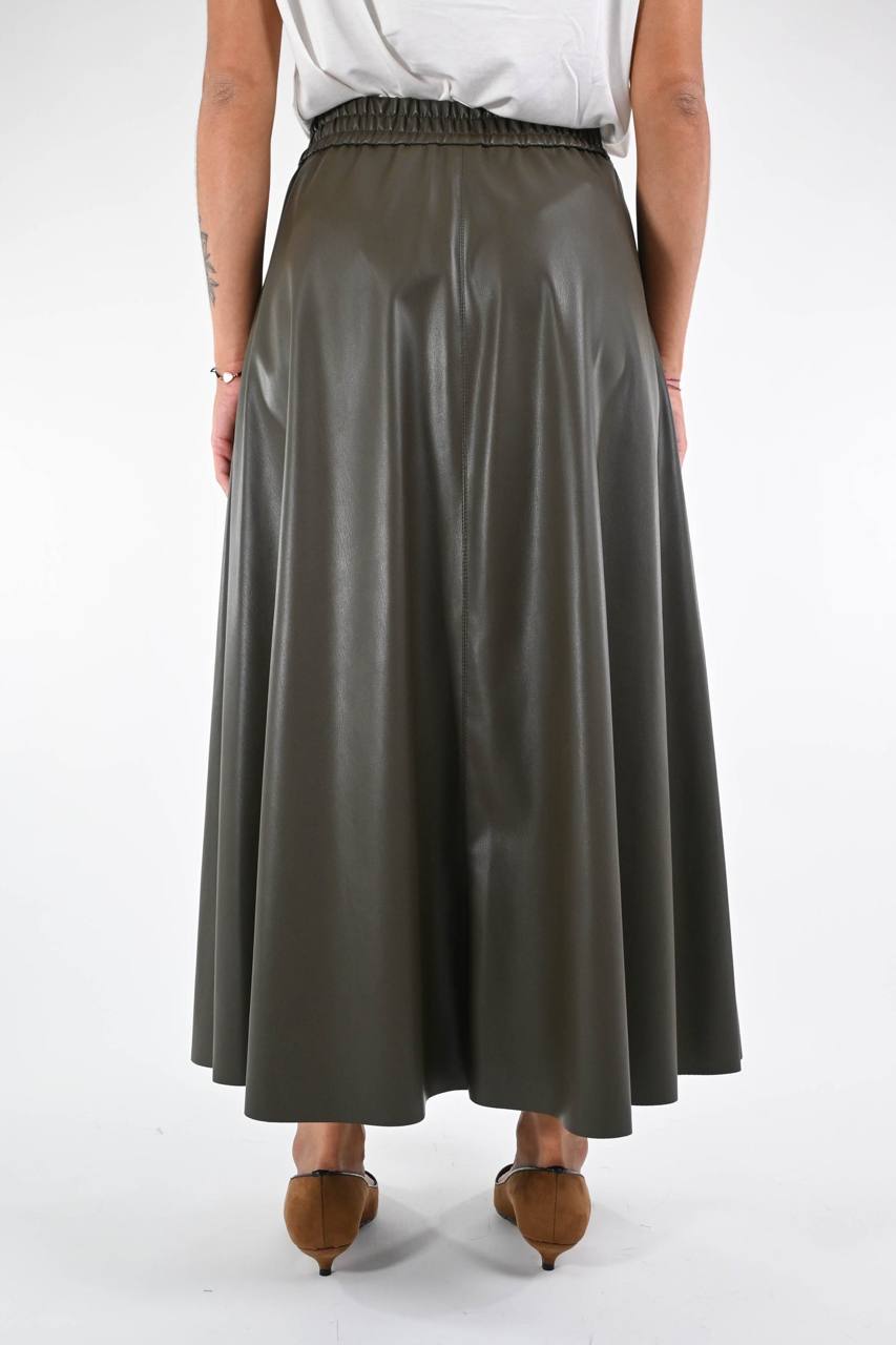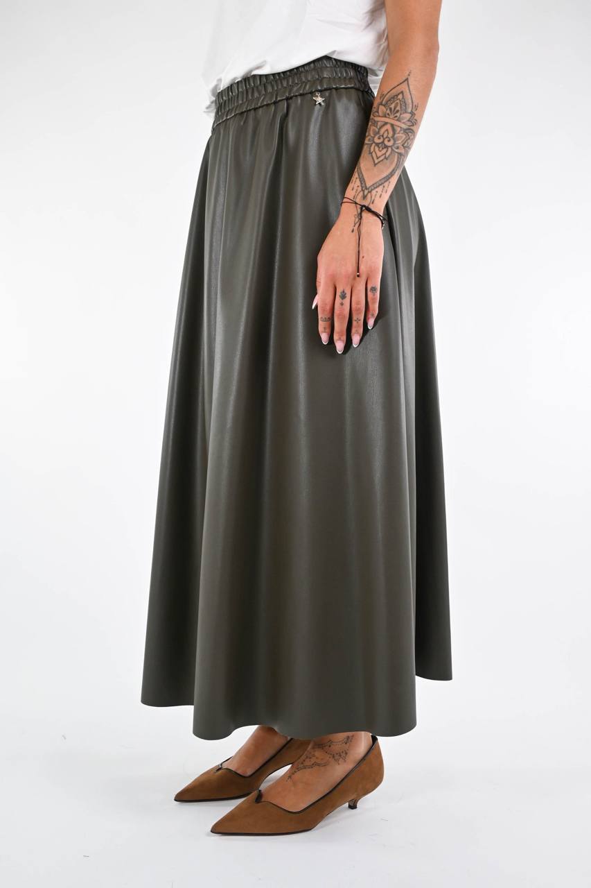 Gonna ampia in ecopelle verde oliva con linea fluida a vita elasticizzata per il massimo comfort. Versatile e raffinata, si abbina facilmente sia a look casual con sneakers che a outfit eleganti con tacchi.