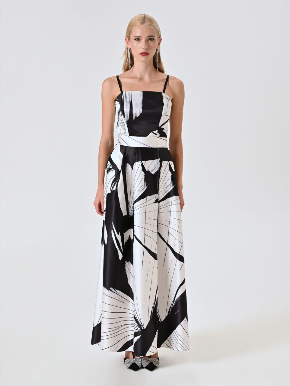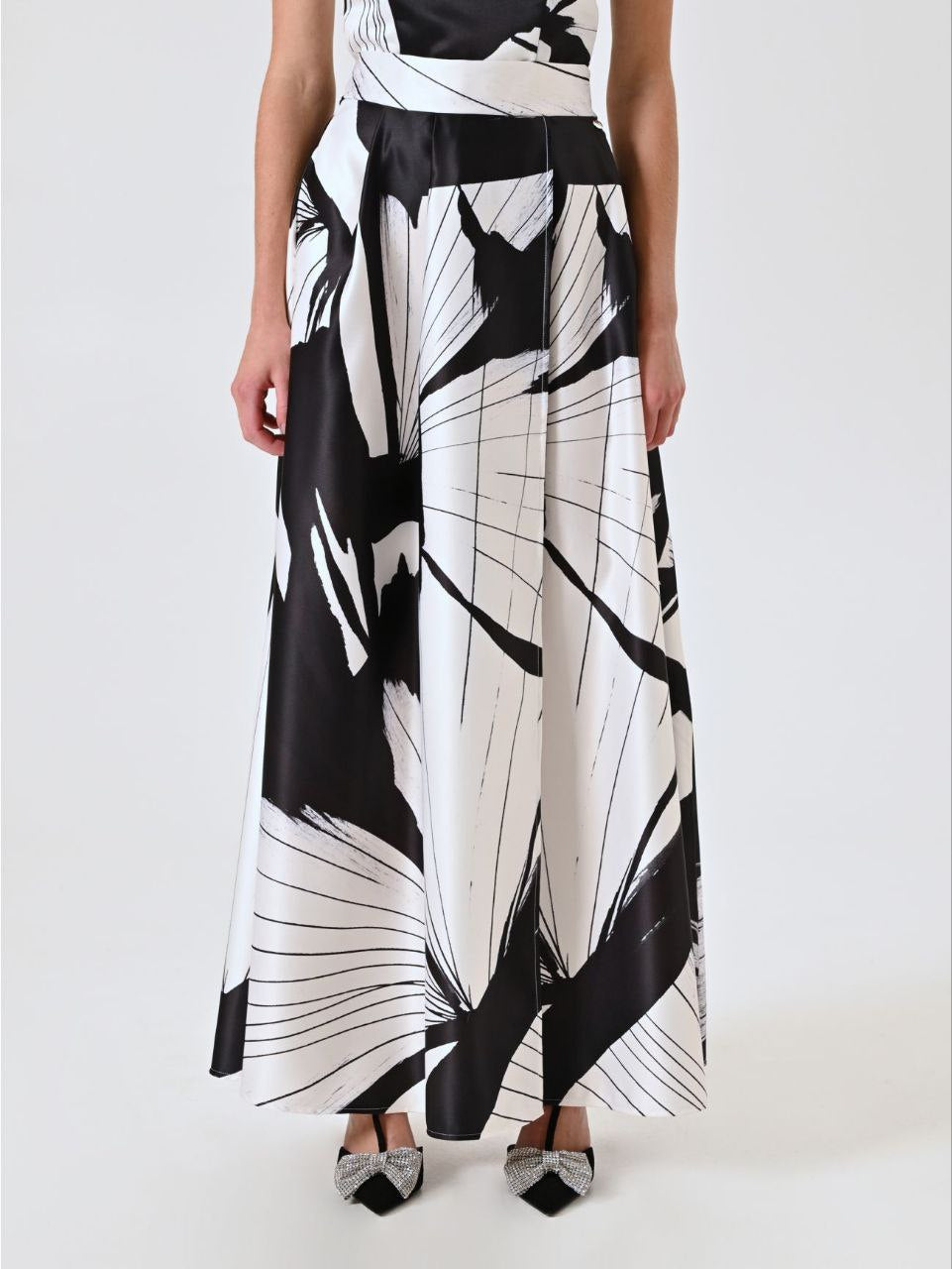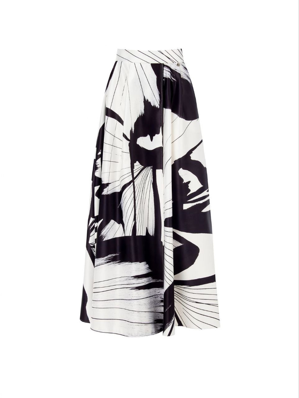 Gonna lunga a vita alta in tessuto fluido con stampa astratta in bianco e nero. Silhouette ampia e leggera, perfetta per look eleganti e contemporanei.