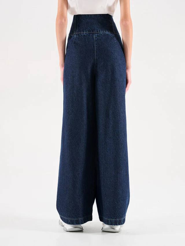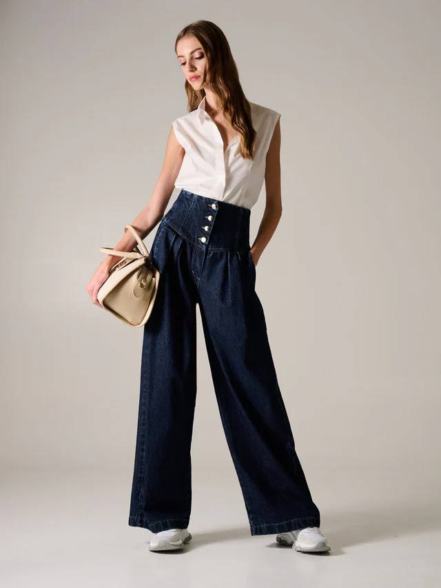 Jeans palazzo a vita alta in denim scuro, caratterizzato da una linea ampia e moderna. La fascia alta con bottoni frontali valorizza il punto vita e definisce la silhouette, mentre la gamba larga e fluida assicura comfort e movimento. Versatile e di tendenza, è perfetto da abbinare a camicie, top o blazer per un look casual chic dal carattere deciso.