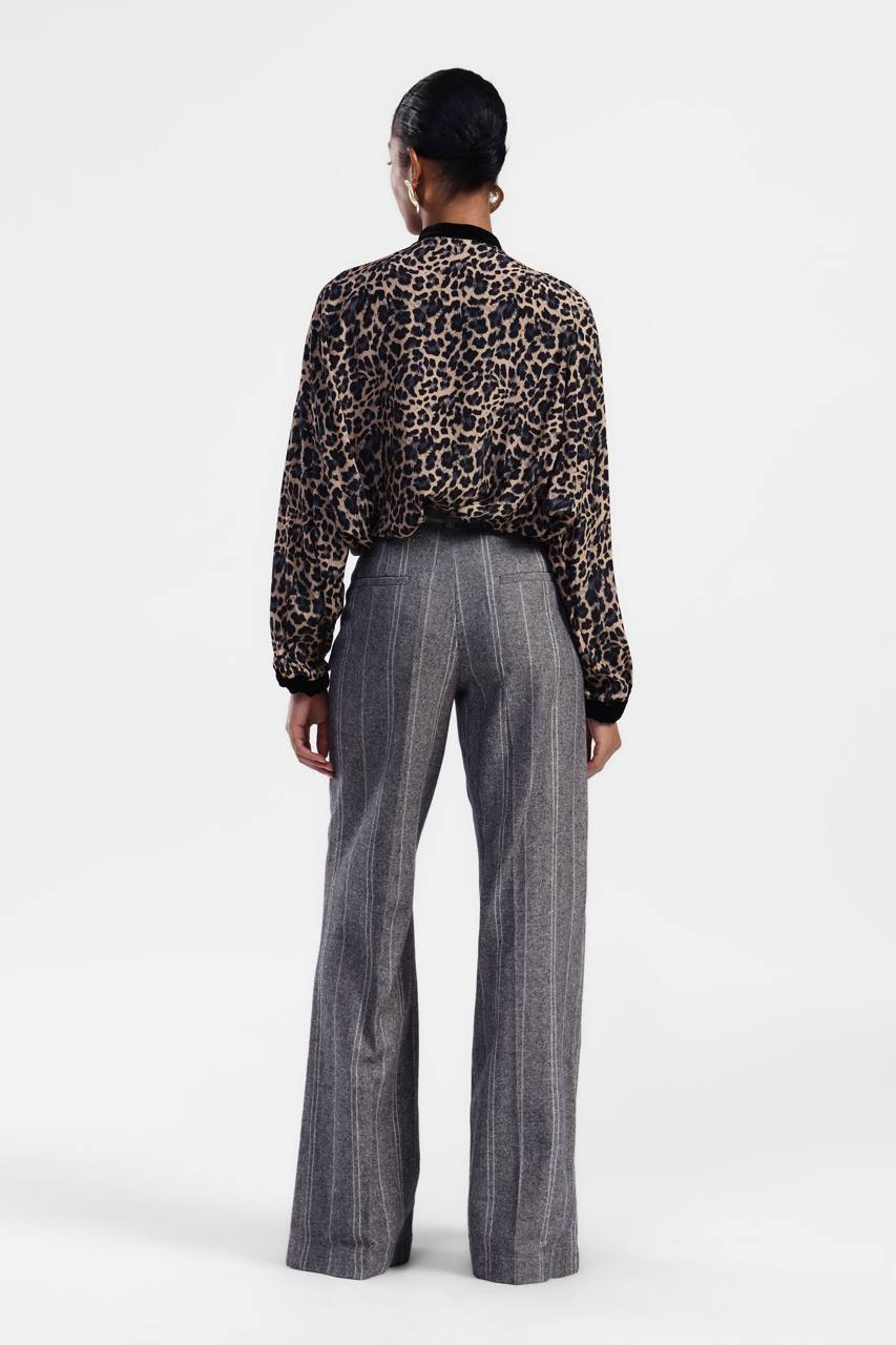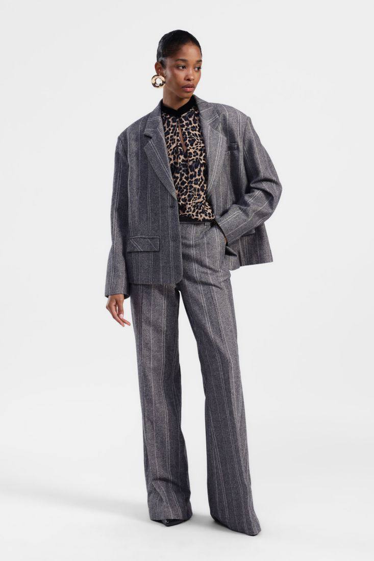 Eleganti pantaloni a vita alta dal taglio dritto con gamba ampia, realizzati in tessuto grigio con sottili righe gessate verticali. Linea sartoriale con chiusura frontale nascosta, perfetti da abbinare con blazer coordinato per un look sofisticato e professionale.