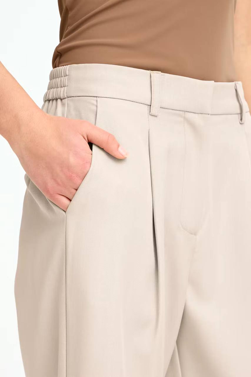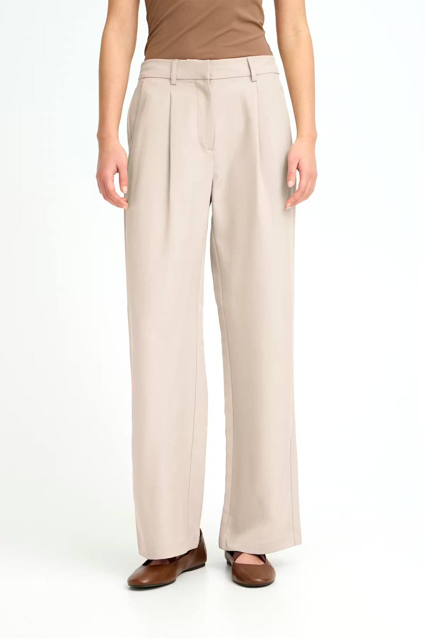 Pantalone lungo dal taglio elegante e contemporaneo, caratterizzato da linea ampia e fluida che valorizza la silhouette. Realizzato in tessuto leggero e morbido, presenta vita regolare con passanti per cintura, chiusura frontale con zip e bottone e pieghe frontali che donano struttura e raffinatezza. Il colore neutro lo rende versatile e perfetto sia per look formali che per abbinamenti più casual-chic.