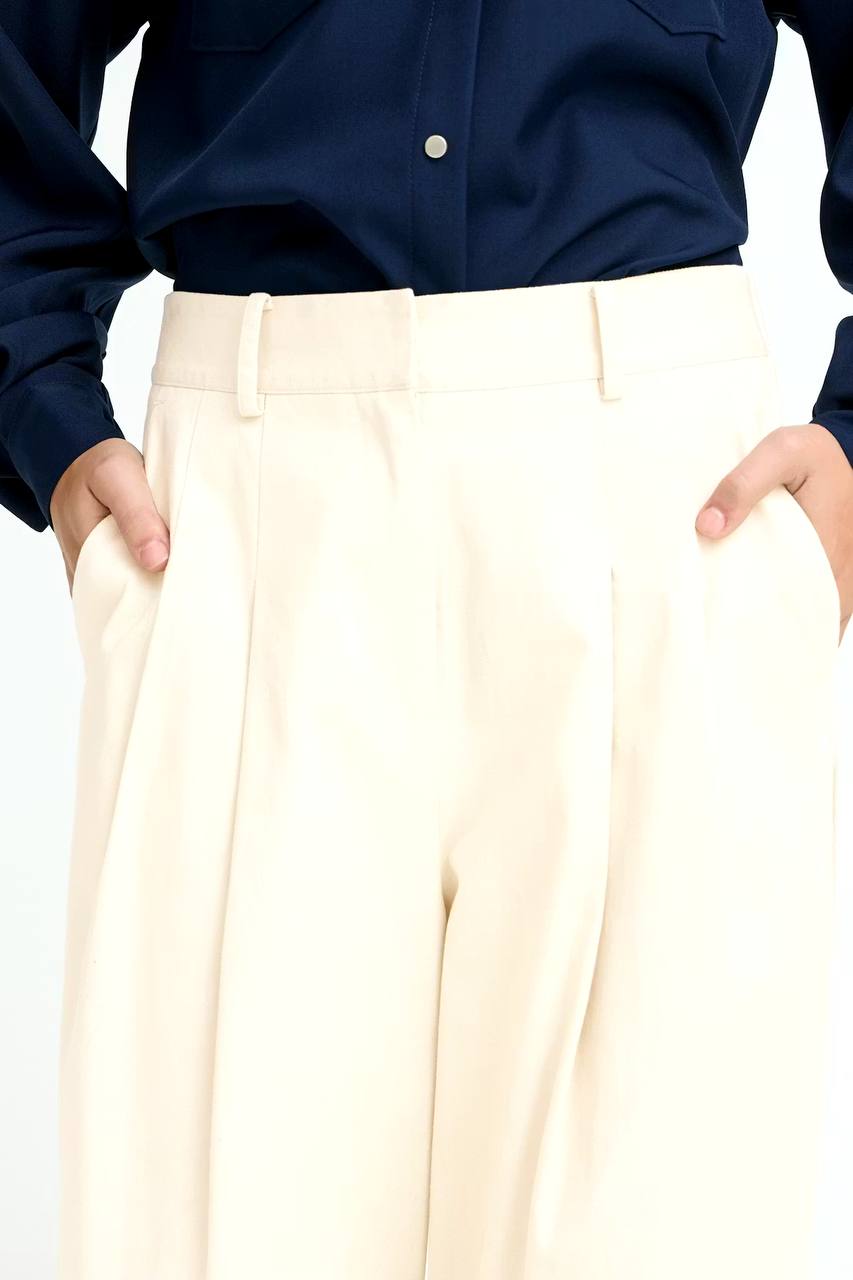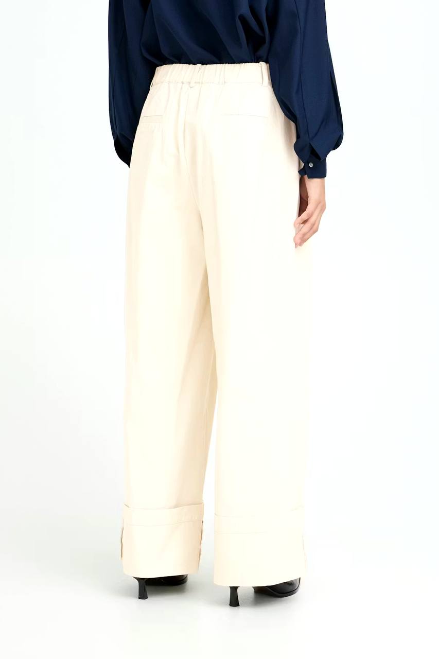 Pantalone palazzo a vita alta in raffinata tonalità panna, realizzato con una linea ampia e fluida che accompagna il movimento e valorizza la silhouette. Le pieghe frontali donano struttura ed eleganza, mentre le tasche laterali e i passanti per cintura aggiungono praticità e versatilità. Il fondo con maxi risvolto definisce il design con un tocco moderno e ricercato, rendendolo perfetto sia per look formali e da ufficio, sia per outfit più sofisticati e contemporanei.
