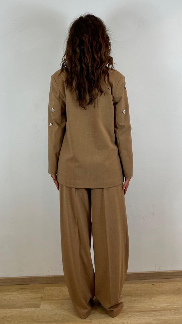 Tailleur color cammello composto da blazer monopetto e pantalone a palazzo, Il blazer è arricchito da applicazioni gioiello che donano luminosità e un tocco elegante al completo. Un outfit sofisticato e versatile, perfetto per occasioni formali e serate speciali
