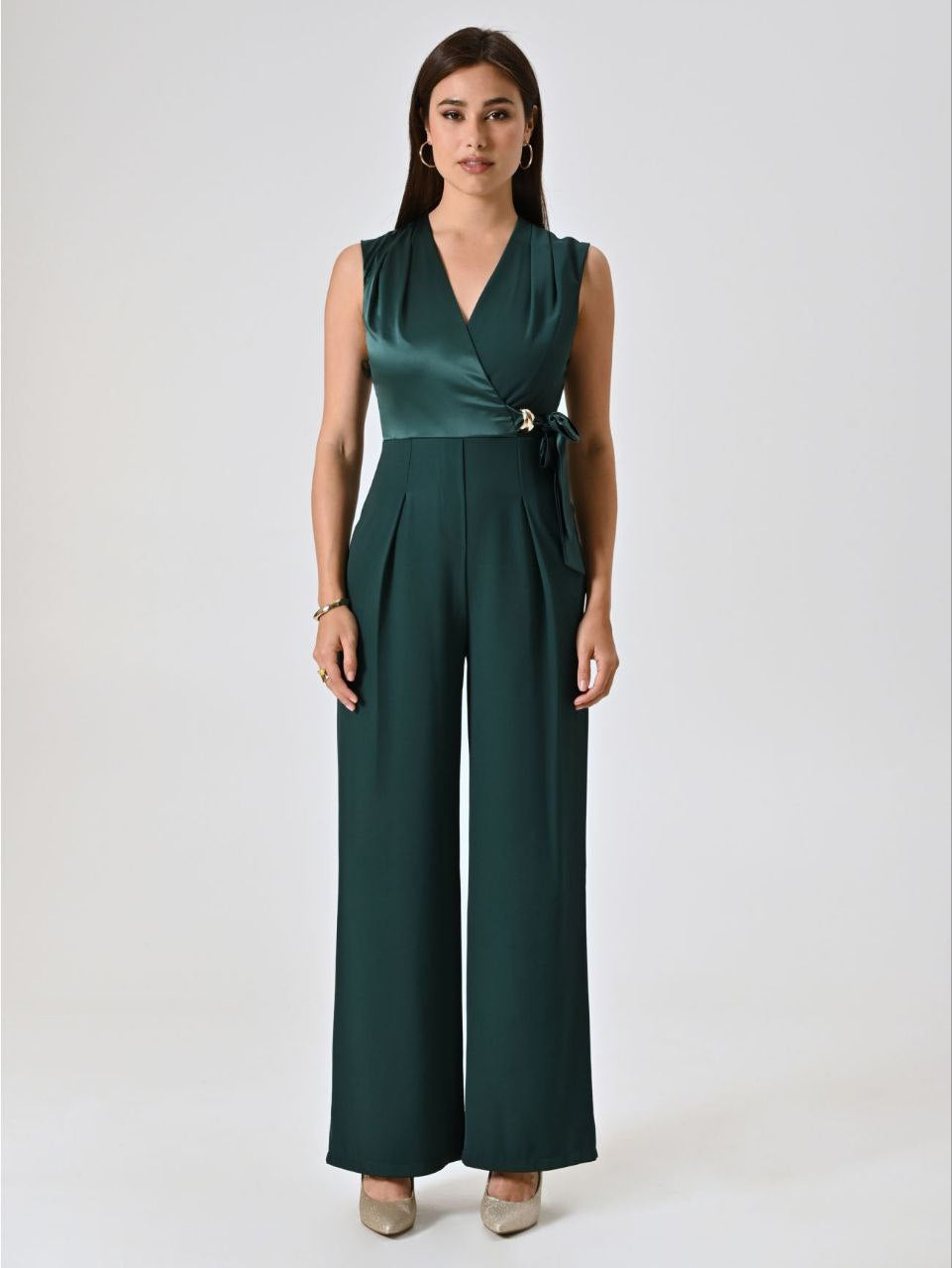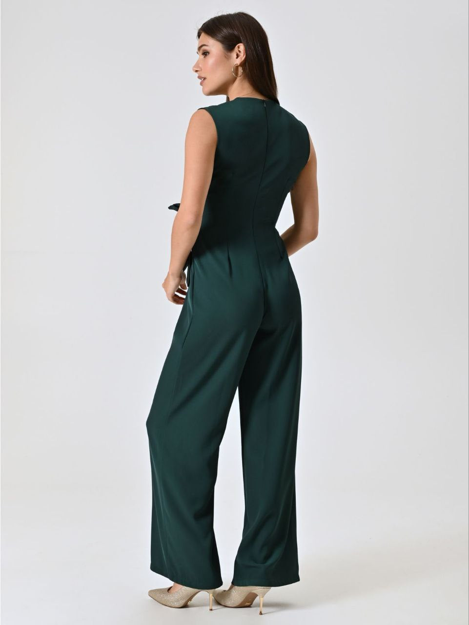 Elegante tuta lunga senza maniche in verde smeraldo, con scollo a V incrociato e dettaglio fiocco in vita. Linea a palazzo che slancia la figura, perfetta per cerimonie e serate speciali.