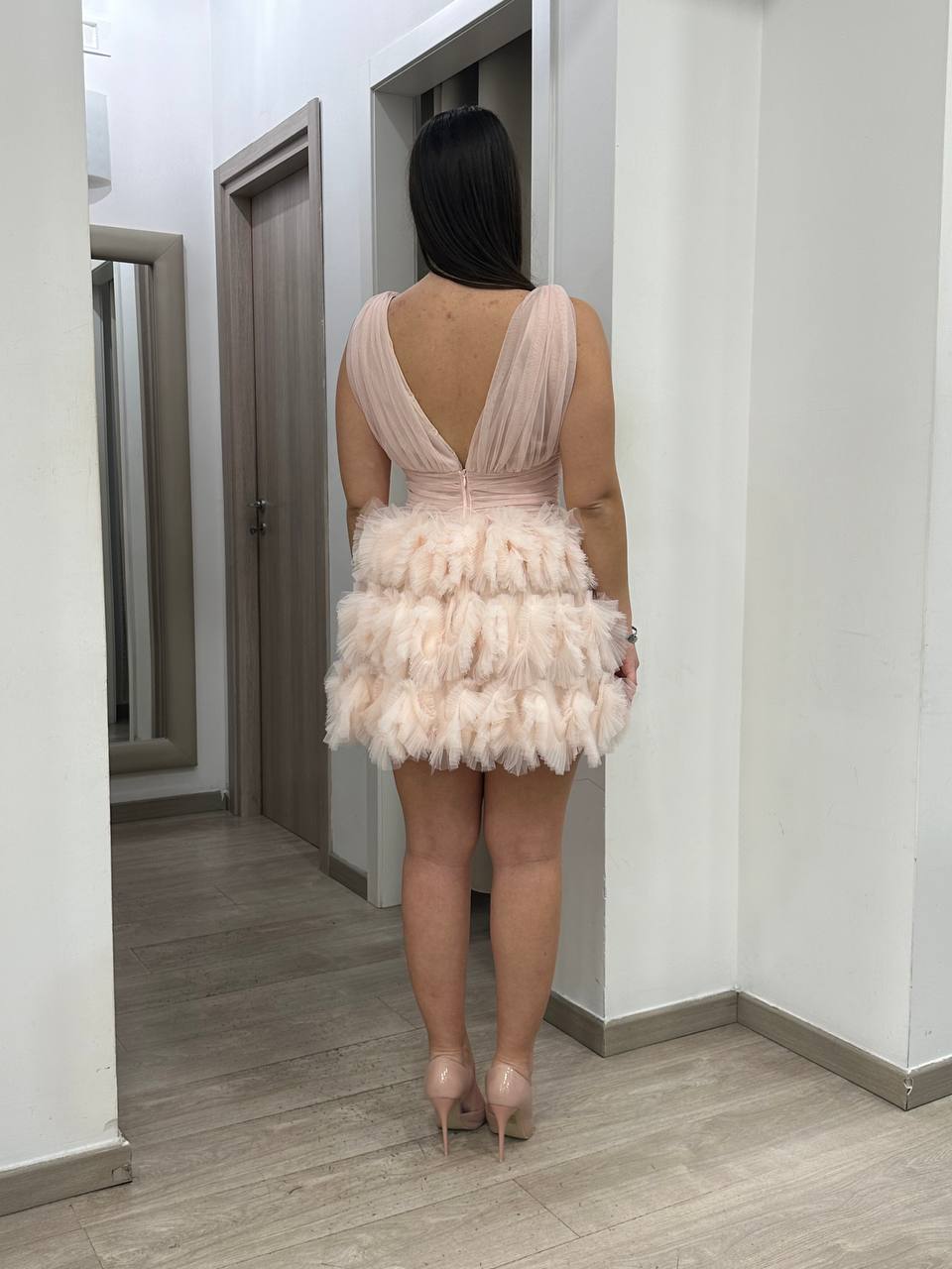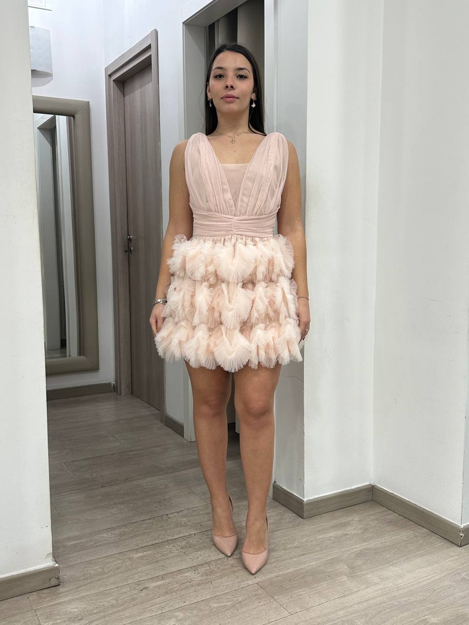 Abito corto dal design romantico e femminile, perfetto per cerimonie ed eventi speciali. Modello smanicato con scollo a V incrociato e corpetto drappeggiato che valorizza il décolleté e definisce il punto vita. La gonna voluminosa è impreziosita da balze in tulle lavorato che donano movimento e leggerezza. Un capo elegante e raffinato, ideale per un look sofisticato e d’impatto.