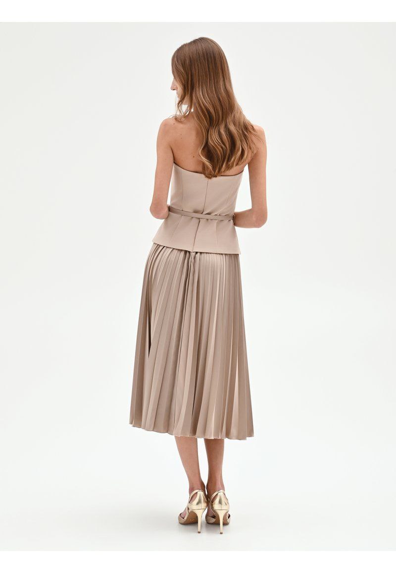 Abito midi dal design elegante e femminile, caratterizzato da corpetto strapless con scollo a cuore e cintura sottile che valorizza il punto vita. La gonna plissé dona movimento e leggerezza, creando una silhouette raffinata e armoniosa. Perfetto per cerimonie, eventi o occasioni speciali.
