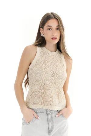 Canotta elegante in raffinato pizzo beige con motivo floreale in rilievo. Modello smanicato con scollo alto che valorizza le spalle e dona un tocco sofisticato al look. Perfetta da abbinare a jeans o pantaloni sartoriali per outfit casual chic o più ricercati. Vestibilità aderente e femminile.