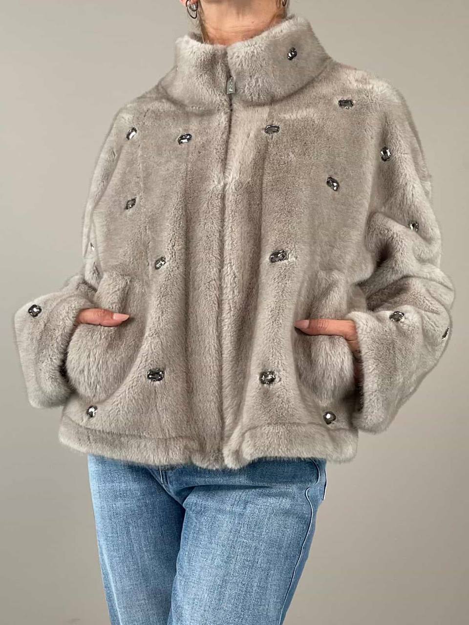 Cappotto in pelliccia sintetica di colore grigio chiaro, con un design elegante e moderno. Il cappotto presenta dettagli brillanti grazie alle pietre decorative che impreziosiscono la superficie. Con una zip frontale e un colletto alto, questo cappotto offre sia comfort che stile, ideale per l'inverno. Le tasche laterali aggiungono praticità, mentre il taglio ampio assicura una vestibilità comoda e trendy. Perfetto per completare look raffinati in occasioni formali o casual.