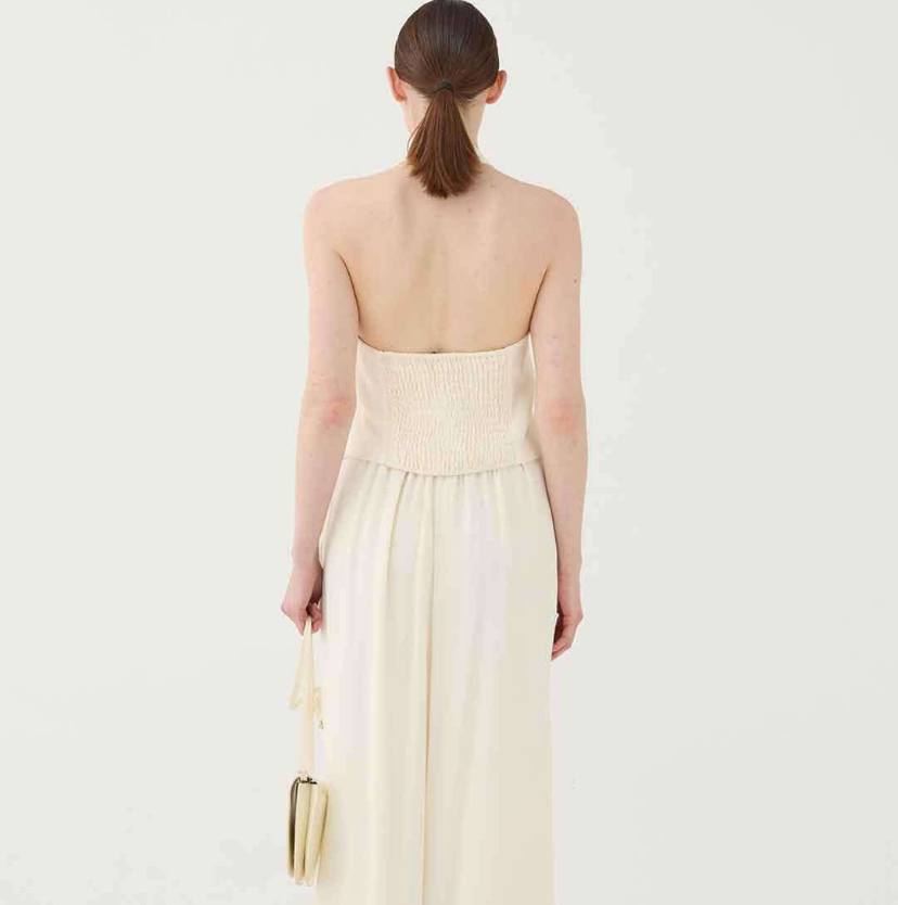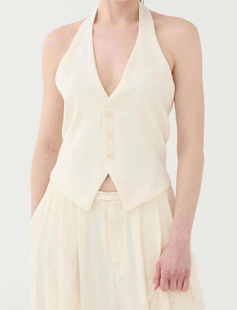 Gilet dal design elegante e minimal, caratterizzato da una linea aderente che valorizza la silhouette. Realizzato in tessuto leggero color avorio, presenta una profonda scollatura a V, chiusura frontale con bottoni e taglio sagomato sul fondo. Il modello con spalle scoperte dona un tocco femminile e sofisticato, perfetto da indossare da solo o abbinato a pantaloni coordinati per un look raffinato e contemporaneo.