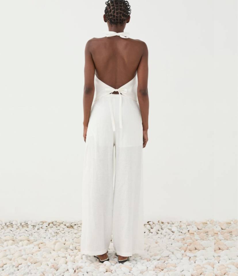 Pantalone ampio color bianco dal design fluido e sofisticato. Realizzato in tessuto leggero e traspirante, presenta una linea morbida a gamba larga e un elegante pannello sovrapposto con cintura in vita che crea un raffinato effetto wrap. Perfetto per look estivi chic e outfit minimal dal gusto contemporaneo.