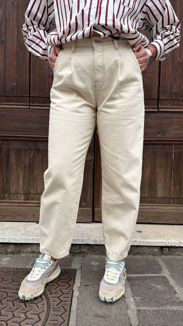 Pantalone dal taglio contemporaneo con vita alta e pince frontali che valorizzano la silhouette. Realizzato in cotone dalla mano morbida, presenta gamba leggermente affusolata e lunghezza alla caviglia per un look moderno e versatile. Chiusura con bottone e zip, passanti in vita e tasche laterali. Perfetto da abbinare a camicie o t-shirt per outfit casual chic adatti a ogni occasione.