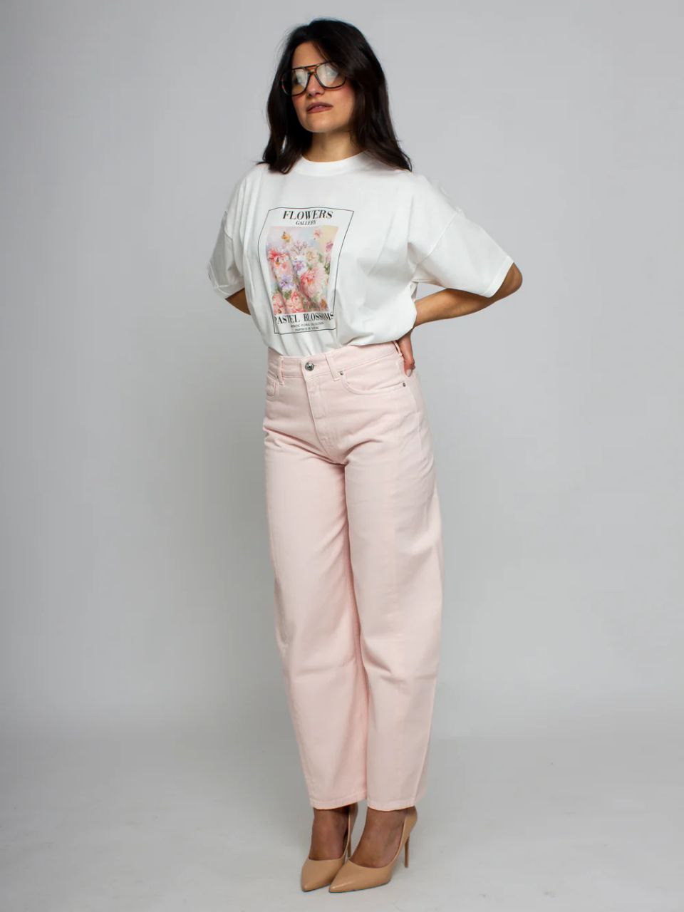 T-shirt bianca in cotone dal fit rilassato, perfetta per un look casual ma ricercato. Il design frontale con stampa floreale dai toni pastello e scritta decorativa dona un tocco romantico e delicato. Girocollo classico e maniche corte la rendono versatile e facile da abbinare, ideale con jeans o pantaloni a vita alta per un outfit fresco e femminile.