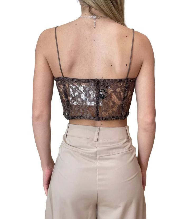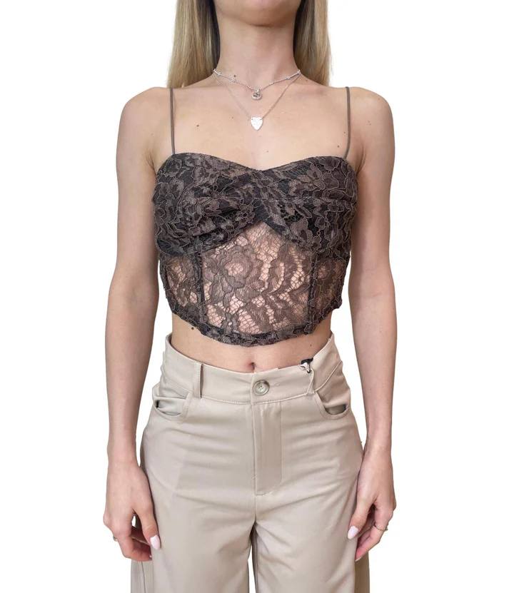Top cropped in pizzo floreale dal design femminile e raffinato. Caratterizzato da spalline sottili e scollo a cuore con dettaglio intrecciato sul davanti, valorizza la silhouette con un effetto semi-trasparente elegante e sensuale. Perfetto da abbinare a blazer o pantaloni a vita alta per un look sofisticato da sera.